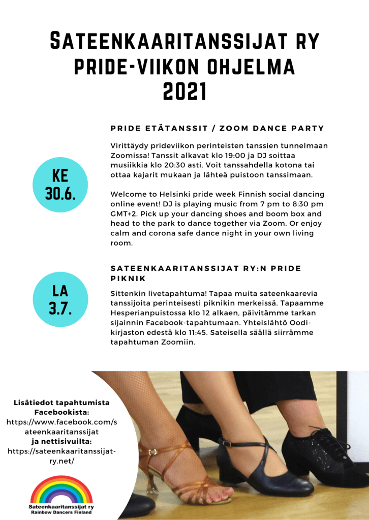 Sateenkaaritanssijat ry:n Pride-viikon ohjelma on nyt julki, ja luvassa on tanssia, biletunnelmaa ja hengailua hyvässä porukassa! Laita tapahtumat seurantaan ja nähdään pian tanssin merkeissä.
